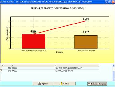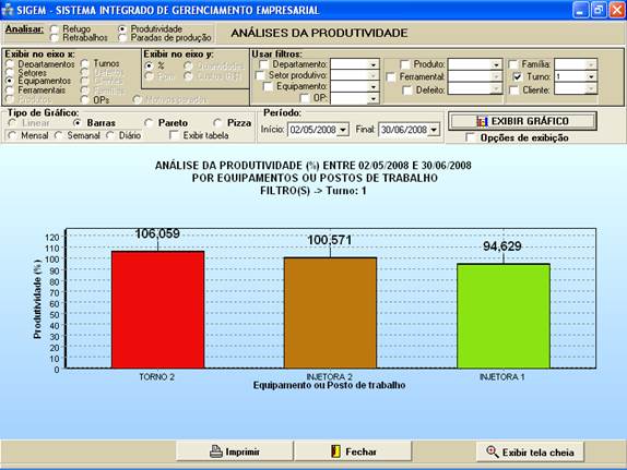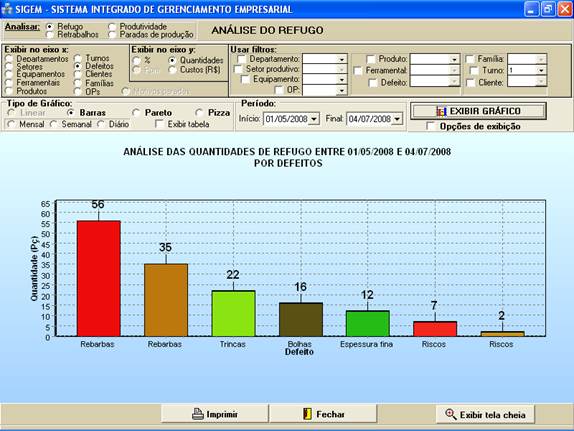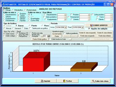 gráficos para análises de refugo, retrabalhos, produtividade e paradas de