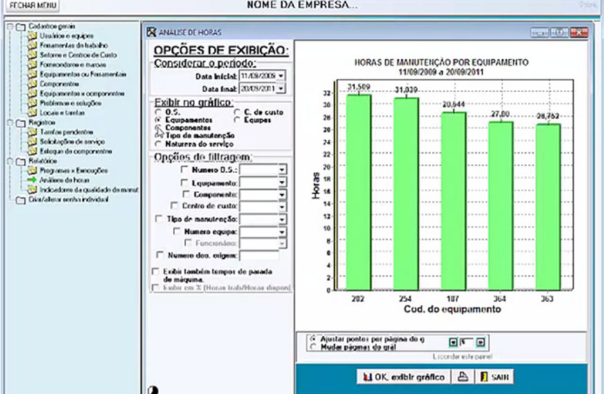  Gráficos de manutenções executadas por setores, máquinas, componentes, tipo de manutenção, totais de horas gastas por mês por tipo de manutenção, por equipes, por equipamentos, por ordens de serviço, etc.