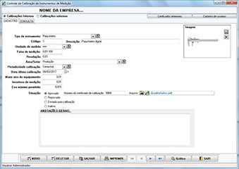 Registro completo de todas as características de cada instrumento de medição, controles de períodos de vida útil e prazos de calibração, com